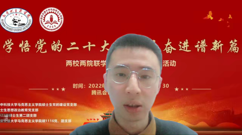 11月18日,为深入学习宣传领会党的二十大精神,感受时代脉搏,汲取奋进力量,西安交通大学马克思主义学院硕1116党、团支部联合华中科技大学马克思主义学院硕士生党的建设党支部、思想政治教育党支部、2021级硕士生第二团支部举办“学悟党的二十大,携手奋进谱新篇”联学共建专题党、团活动。华中科技大学马克思主义学院党委副书记、副院长王明飞,西安交通大学马克思主义学院团委副书记、辅导员梁佳艺出席线上会议,各支部全体成员参与。本次活动由西安交通大学马克思主义学院硕1116团支部书记乔金妍主持。