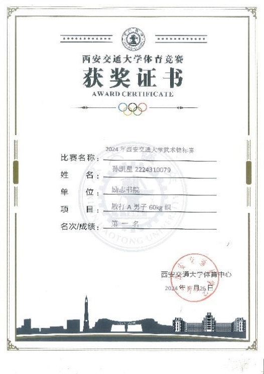 孙凯星不仅学习成绩优异,还注重全面发展。他热爱武术,并积极参加体育锻炼,连续两年体育课程成绩位列班级第一,每天坚持健身一个半小时,荣获2024年西安交通大学武术锦标赛男子散打第一名。他将文武之道融会贯通,在强健体魄的同时,也磨练着意志,为未来的人生之路打下坚实的基础。