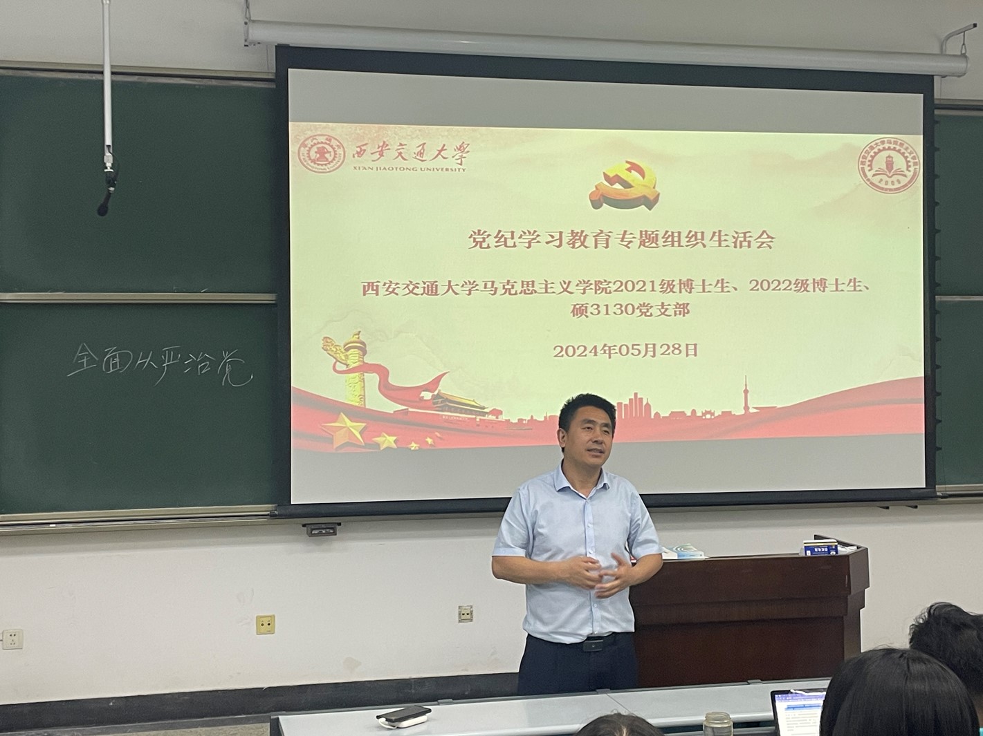 5月28日晚,马克思主义学院院长燕连福教授走进2021级博士生党支部、2022级博士生党支部和硕3130党支部联合开展的党纪学习教育专题组织生活会,在主C-106教室为支部党员讲授主题党课。参会各支部党员认真聆听,积极参与讨论交流,反响热烈。