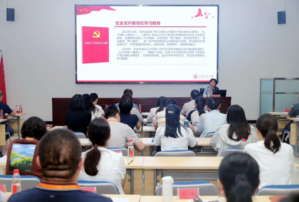 张萍围绕“高质量开展党纪学习教育,着力推动学校高质量发展”的主题,从深刻认识《条例》的重要意义,准确把握主旨要义,把纪律规矩转化为政治自觉、思想自觉、行动自觉,持续强化基层党组织政治功能与组织功能,推进党建业务融合发展,推动机关作风持续向上向好等方面,讲授专题党课。